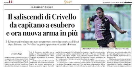 L'edizione odierna de "La Repubblica" si sofferma su Roberto Crivello. Quando Roberto Crivello ha fatto il suo ingresso in campo...