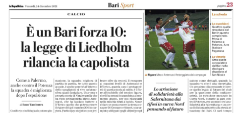 L'edizione odierna de "La Repubblica" si sofferma sulla forza del Bari quando resta in dieci uomini. Così forte e in...