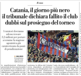 L'edizione odierna de "La Repubblica" si sofferma sul fallimento del Catania che sa ieri è ufficiale. L’agonia del Calcio Catania...