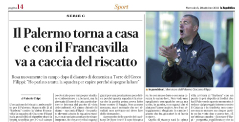 L'edizione odierna de "La Repubblica" si sofferma sulla gara di stasera tra Palermo e Virtus Francavilla, gara in cui il...