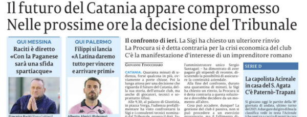 L'edizione odierna de "La Sicilia" si sofferma sul futuro del Catania con l'attesa della decisione da parte del Tribunale a...