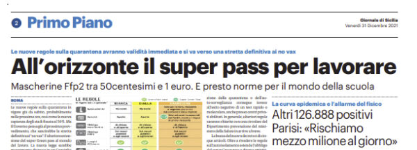 L'edizione odierna de "Il Giornale di Sicilia" si sofferma sul Super Green Pass presto in arrivo anche per i lavoratori....