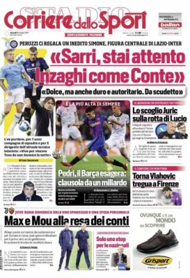 Prima pagina Corriere dello Sport: “Max e Mou alla resa dei conti. Peruzzi regala un inedito Inzaghi: «Lui come Conte»”
