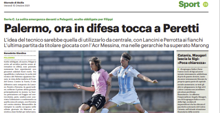 L'edizione odierna de "Il Giornale di Sicilia" si sofferma su Peretti chiamato in causa viste le tante assenze in difesa....