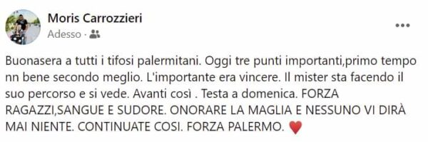 Ad esultare per la vittoria del Palermo contro il Monterosi è stato anche l'ex rosanero Moris Carrozzieri. Ecco quanto scritto...