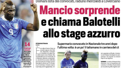 L'edizione odierna de "Il Corriere dello Sport" si sofferma su Balotelli e sulla Nazionale. È un colpo di tacco, forse...