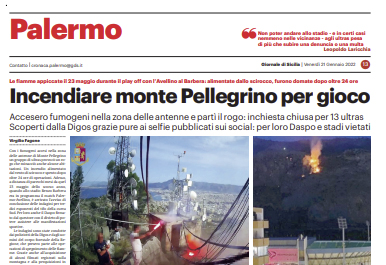 L'edizione odierna de "Il Giornale di Sicilia" si sofferma sull'incendio appiccato da alcuni tifosi durante una gara del Palermo contro...