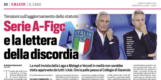 L'edizione odierna de "Il Corriere dello Sport" si sofferma sull'alta tensione che potrebbe portare ad una spaccatura tra Serie A...