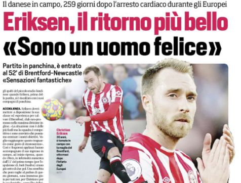L'edizione odierna de "Il Corriere dello Sport" si sofferma su Eriksen e il suo ritorno in campo. «Sono un uomo...