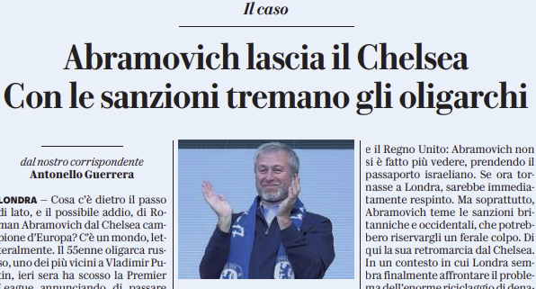 L'edizione odierna de "La Repubblica" si sofferma sulla guerra in Ucraina che in qualche modo coinvolge anche Abramovich, costretto a...