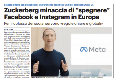 L'edizione odierna de "Il Giornale di Sicilia" si sofferma sulla "minaccia" di Mark Zuckerberg. Facebook e Instagram potrebbero abbandonare l’Europa...