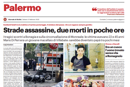 L'edizione odierna de "Il Giornale di Sicilia" si sofferma sugli incidenti mortali di ieri per le strade di Palermo. Le...