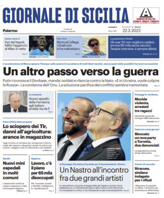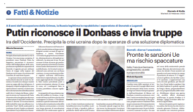 L'edizione odierna de "Il Giornale di Sicilia" si sofferma su vari temi in prima pagina. Putin riconosce il Donbass, manda...