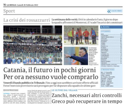 L'edizione odierna de "La Sicilia" si sofferma sull'attesa del Catania in vista della prossima asta. Nessuno (per ora) vuole comprare...