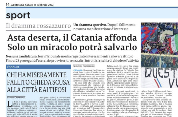 L'edizione odierna de "La Sicilia" si sofferma sul Catania dopo l'asta andata deserta. Il 28 scadrà l’esercizio provvisorio. Se entro...