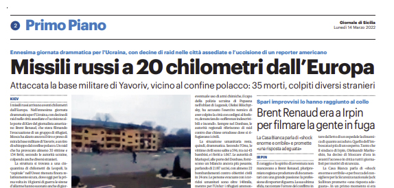 L'edizione odierna de "Il Giornale di Sicilia" si sofferma sulla guerra in Ucraina. I missili russi arrivano a venti chilometri...