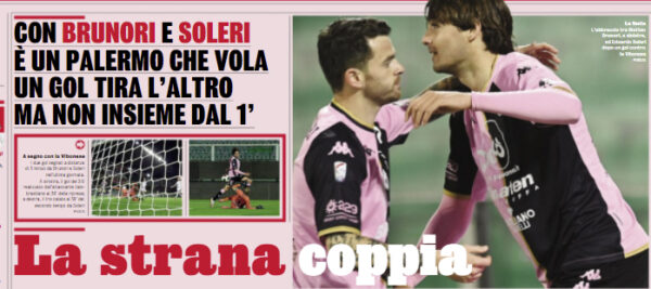 L'edizione odierna de "La Gazzetta dello Sport" si sofferma sulla coppia di goleador rosanero Brunori-Soleri. Separati è meglio, anche se...