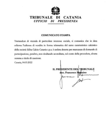 Il Tribunale di Catania ha reso noto un comunicato sull'esito della seconda asta per la vendita del club etneo. Ecco...