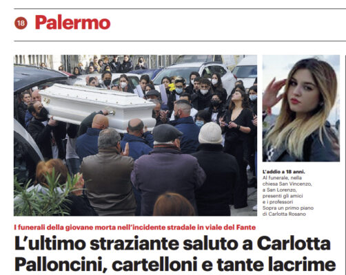 Gds: “Palermo. L’ultimo straziante saluto a Carlotta Palloncini, cartelloni e tante lacrime”