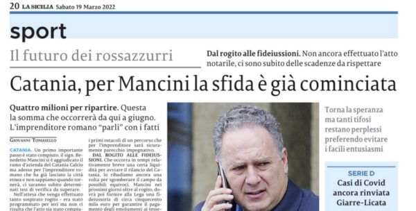 L'edizione odierna de "La Sicilia" si sofferma sull'arrivo di Mancini al Catania. Mancini nei prossimi giorni, oltre al rogito, dovrà...