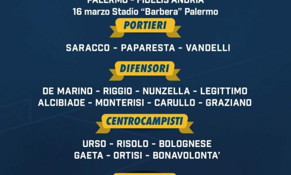 Sono 21 i convocati dallo staff tecnico in vista del match tra Palermo e Fidelis Andria. Oltre allo squalificato Ciotti...