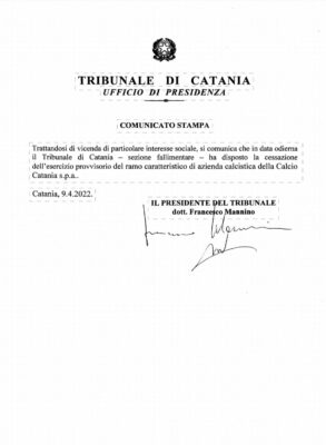 Il Tribunale di Catania ha emesso una note nel quale viene annunciata l'interruzione dell'esercizio provvisorio del Calcio Catania Spa. Ecco...