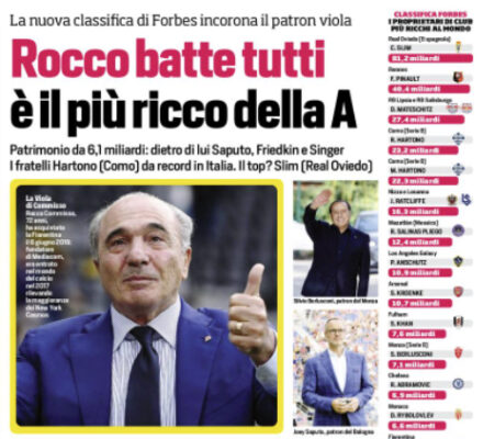 L'edizione odierna de "Il Corriere dello Sport" si sofferma sui presidenti più ricchi in serie A con il viola Commisso...
