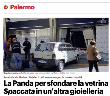 L'edizione odierna de "Il Giornale di Sicilia" si sofferma sulle gioiellerie prese d'assalto a Palermo. Una vecchia Fiat Panda presa...