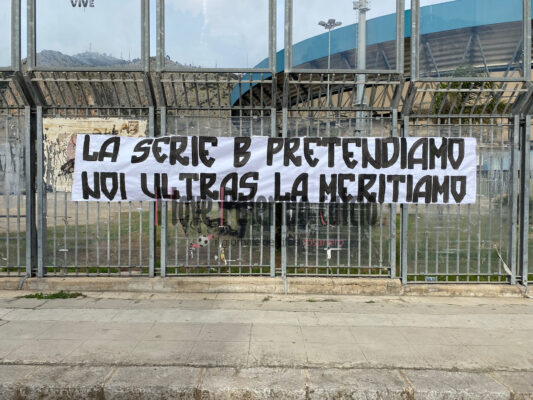 Uno striscione è apparso appeso fuori i cancelli del Renzo Barbera al termine della gara vinta dal Palermo contro il...