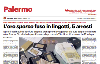 L'edizione odierna de "Il Giornale di Sicilia" si sofferma su 5 arresti a Palermo per l'oro fuso. I lingotti d’oro...