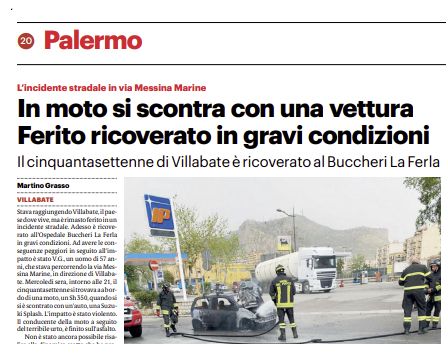 L'edizione odierna de "Il Giornale di Sicilia" si sofferma sull'incidente stradale avvenuto nei giorni scorsi. Stava raggiungendo Villabate, il paese...