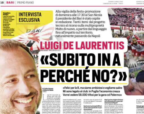 L'edizione odierna de "Il Corriere dello Sport" si sofferma sulle parole di De Laurentiis, presidente del Bari. Luigi De Laurentiis...