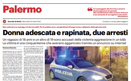 L'edizione odierna de "Il Giornale di Siclia" si sofferma sulla donna adescata e rapinata a Palermo. L’appuntamento per un incontro...