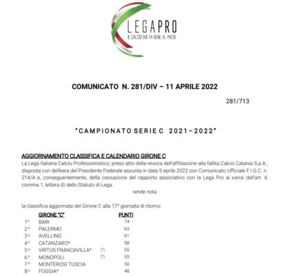 AGGIORNAMENTO CLASSIFICA E CALENDARIO GIRONE C La Lega Italiana Calcio Professionistico, preso atto della revoca dell’affiliazione alla fallita Calcio Catania...