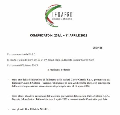 Attraverso il proprio sito ufficiale la Lega Pro dichiara la revoca dell'affiliazione del Calcio Catania. Ecco la nota: Comunicazioni della...