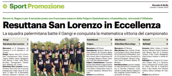 L'edizione odierna de "Il Giornale di Sicilia" si sofferma sulla promozione del Resuttana San Lorenzo in Eccellenza. Si impone 3-1...