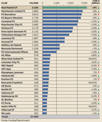 L'edizione odierna de "Il Sole 24 Ore" si sofferma sul calcio in Europa e un club dal valore di 37...