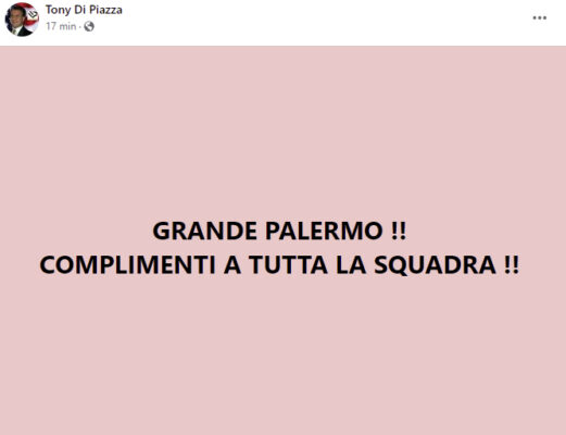Anche Tony Di Piazza sui propri social festeggia per la vittoria del Palermo contro la Feralpisalò. In alto il post...