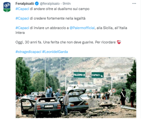 Attraverso il proprio profilo Twitter la Feralpisalò ha pubblicato un post in memoria della strage di Capaci nel trentennale che...
