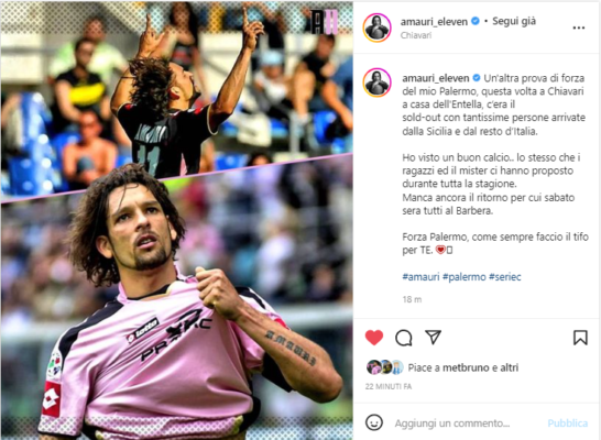 Attraverso il proprio profilo Instagram Amauri ha commentato la vittoria del Palermo contro la Virtus Entella di ieri sera. Ecco...