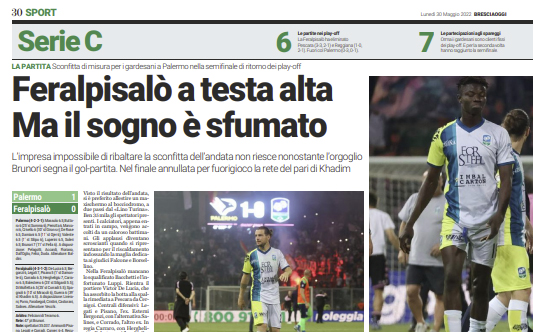 L'edizione odierna di "Brescia Oggi" si sofferma sulla gara persa ieri dalla Feralpisalò contro il Palermo. L’impresa impossibile non riesce....