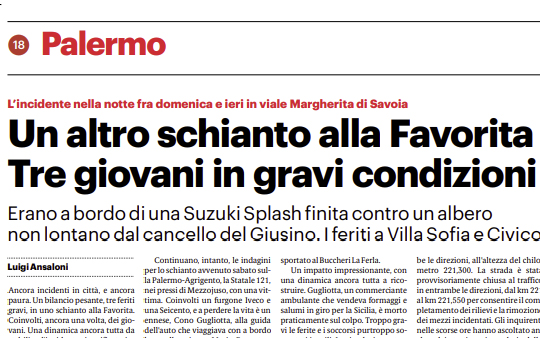 L'edizione odierna de "Il Giornale di Sicilia" si sofferma sull'ennesimo incidente stradale sulle strade di Palermo. Ancora incidenti in città,...