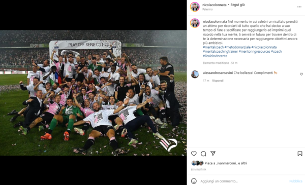 Attraverso il proprio profilo Instagram il Mental Coach Colonnata ha pubblicato il seguente post in merito alla promozione: "Nel momento...