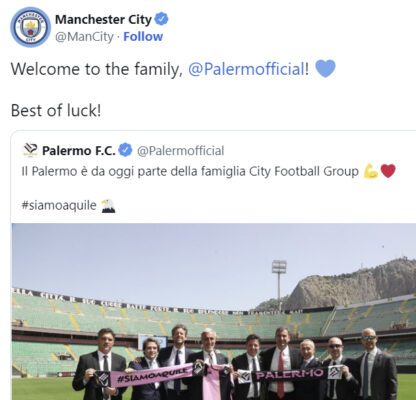 Attraverso il proprio profilo Twitter il Manchester City ha dato il benvenuto al Palermo nella famiglia City Group. https://twitter.com/ManCity/status/1543949136654917632?s=20&t=eESYpJFLmJJ-kjEHRC8kPg