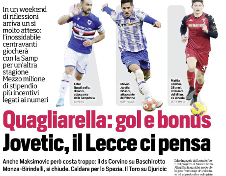 Corriere dello Sport: “Quagliarella: gol e bonus. Jovetic, il Lecce ci pensa. Tutte le trattative del giorno in serie A”