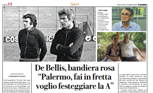 L'edizione odierna de "La Repubblica" riporta un'intervista a De Bellis, bandiera rosa, il quale si è espresso in merito al...