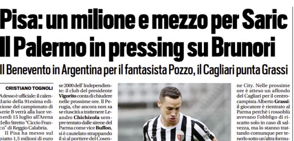 Tuttosport: “Pisa: un milione e mezzo per Saric. Il Palermo in pressing su Brunori. Tutte le trattative del giorno in serie B”