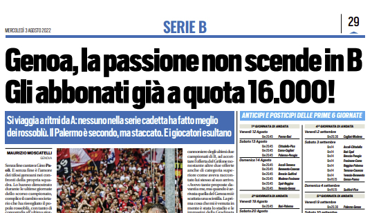 L'edizione odierna di Tuttosport si sofferma sugli abbonati in serie B, con il Genoa primo per numero di tessere sottoscritte....