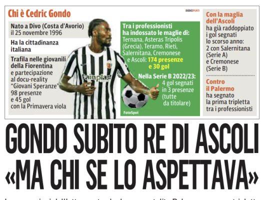 Corriere Adriatico: “L’attaccante che ha ammutolito Palermo con una tripletta. Gondo subito re di Ascoli: «Ma chi se lo aspettava»”
