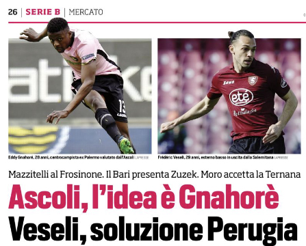Corriere dello Sport: “Ascoli, l’idea è Gnahorè. Veseli, soluzione Perugia. Tutte le trattative del giorno in serie B”